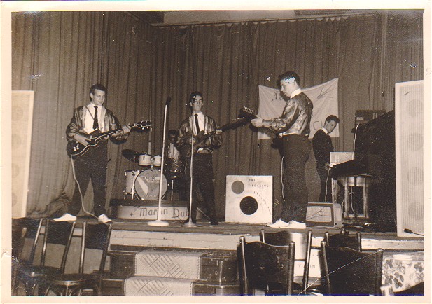 Een schoolavond van de examenklas van de Kalsbeek ULO in Concordia Woerden. Wij zijn uitgenodigd om te spelen. Wim heeft een (zwarte) electrische gitaar van Jaap Smallenburg geleend. Jaap Los speelt op Wim's nieuwe zelfgemaakte gitaar.