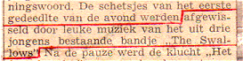 Er moest natuurlijk een drummer bij, maar niemand had een drumstel in Harmelen. Niet getreurd, ze maakten er een. Een fietswiel met een zinken plaat eromheen, een oude banjo voor trommel en een echt bekken. Het leek heel wat uit de verte. Hans van Bemmel werd gestrikt om drummer te zijn. We noemden onszelf "The Swallows".